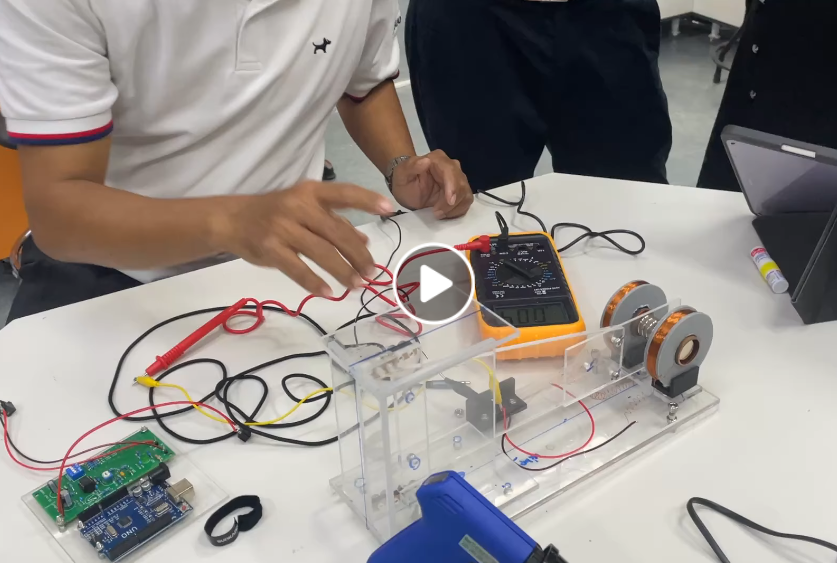 Finally, it's time to assemble the coils and magnetic circuits and mount them onto the Arduino boards. These are being attached to the acrylic plates that Professor P urgently made for us overnight after I asked him yesterday. Preparations were extremely tight—materials ordered online arrived late, and there was an ordering mistake for the copper pipes used for braking. Professor P's last-minute efforts saved the day.